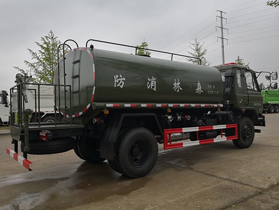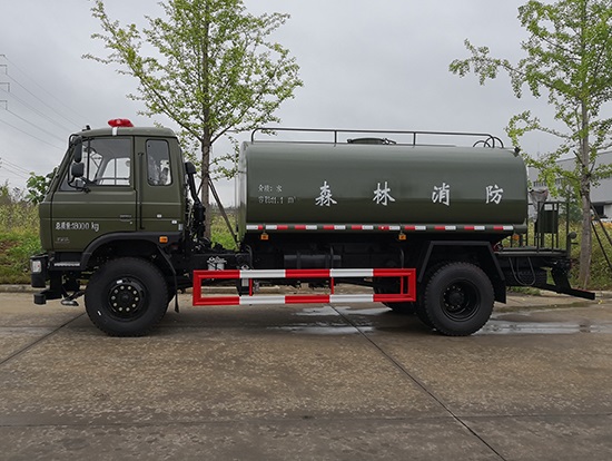 采用東風(fēng)EQ2180GD5DJ型越野汽車(chē)底盤(pán),東風(fēng)一排半寬體駕駛室,4×4驅(qū)動(dòng),康明斯ISB190 50國(guó)五發(fā)動(dòng)機(jī),六檔變速箱,東風(fēng)商用車(chē)橋,前驅(qū)動(dòng)橋3.8噸,后橋10噸,10.00R20輪胎,軸距4500mm,電動(dòng)玻璃,方向助力,斷氣剎,ABS。罐體采用優(yōu)質(zhì)碳鋼QB235板材,板材厚度4mm,罐體容積11.1立方,變速箱安裝取力器,大功率水泵可泵進(jìn)泵出,后置工作平臺(tái)帶水炮射程25米,消防栓接口左右各一個(gè),選裝駕駛室頂部安裝長(zhǎng)條警燈帶喊話(huà)器,全車(chē)顏色軍綠,兩側(cè)噴涂白色森林消防字樣。