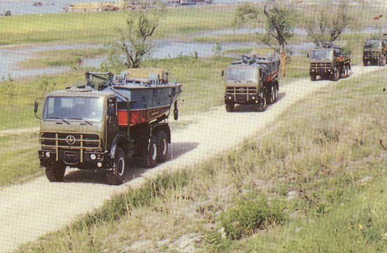 鐵馬XC2200重載卡車在1980年后期進(jìn)入PLA服役,主要用于運(yùn)輸重型工程設(shè)備和武器系統(tǒng)。中國鐵馬(Tiema) XC2200重載卡車由西南汽車廠(現(xiàn)在北方- 奔馳卡車公司分部)制造,位于重慶(Chongqing)市?ㄜ囈缘聡焚惖滤-奔馳2060型卡車為基礎(chǔ)。目前卡車在PLA服役中,被當(dāng)做重型工程設(shè)備卡車和武器系統(tǒng)車底盤。PLA在1970年后期訂購了少量的德國梅賽德斯-奔馳2026型重載卡車(8噸的容量,6X6)補(bǔ)充它不足的重載卡車。這些卡車主要地用于重型火炮拖車任務(wù)。PLA對車輛的性能印象深刻,并且接洽梅賽德斯- 奔馳公司去得到許可在中國聯(lián)合生產(chǎn)卡車。鐵馬XC2200(最初即是TM-SC2030)的發(fā)展,梅賽德斯- 奔馳2060型的一個中國仿造型,從1980年早期開始。 西南汽車廠,一個中國北方工業(yè)總公司(NORINCO)位于重慶(Chongqing)市的下屬公司,被選擇當(dāng)做主承包商。1982年看到了原型的介紹。稍后在1985年中國從西德引進(jìn)了ZF機(jī)械變速箱和KHD413風(fēng)冷柴油發(fā)動機(jī)技術(shù),兩者在鐵馬XC2200卡車上被采用。XC2200批量生產(chǎn)在1986年開始,每年從生產(chǎn)線上生產(chǎn)2,000輛。大多數(shù)的這些車輛被PLA接收用于重貨物/設(shè)備運(yùn)輸、火炮拖車和武器系統(tǒng)車底盤。車輛包括在西藏高地、戈壁沙漠和中國最惡劣的道路和天氣狀況區(qū)域展示了優(yōu)良性能和可靠性。除了被PLA部署,車輛也被輸出到巴基斯坦、泰國、印尼和斯里蘭卡。XC2200采用雙車門正向控制駕駛室,位于發(fā)動機(jī)艙上面。駕駛室有四個座位和在頂板有一個天窗。后面的貨物車身的后擋板和側(cè)擋板可放下,可拆卸蓬架和帆布蓬。單預(yù)備輪被垂直地安裝在乘員室后面,靠近載貨車箱在駕駛室和后貨物車體之間。這一個空間能用來容納一個修理工具箱和其它的裝載/卸貨設(shè)備。與第一代中國自行生產(chǎn)的重型臺車相比較,XC2200有好很多的通用性能,連同85公里/小時的最大道路速度和一個8噸的越野裝載能力。ZF5S-110/111 GPA變速箱有九個前進(jìn)檔和一個倒車檔。三個車軸和六個車輪全部運(yùn)行使用速度差速器鎖定裝置,即使當(dāng)車輛的一側(cè)上一個或更多的車輪沒有與地面接觸中,或已經(jīng)失去牽引,確保車輛持續(xù)驅(qū)動。除了基本的貨物卡車改型之外,XC2200也可得到許多其它的改型, 包括4X4、8X8、長軸距貨車、起重機(jī)、掩護(hù)所、架橋車、運(yùn)船車、道路鋪設(shè)車和多種武器系統(tǒng)車底盤。中國也已經(jīng)發(fā)展基于XC2200設(shè)計的WZ551輪式裝甲人員輸送車(APC)。鐵馬XC2200浮橋架橋卡車。鐵馬XC2200用于WS-1多管火箭發(fā)射裝置車底盤。鐵馬XC2200用于運(yùn)船車。