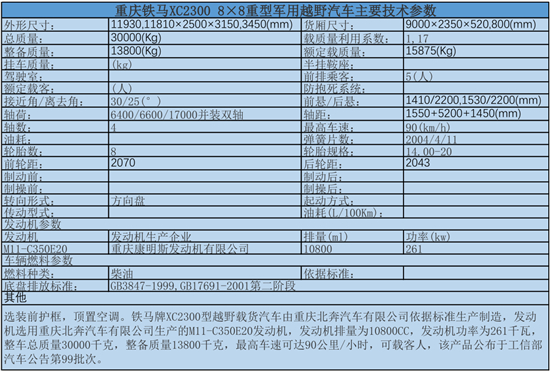 鐵馬牌XC2300型越野載貨汽車由重慶北奔汽車有限公司依據(jù)標(biāo)準(zhǔn)生產(chǎn)制造,發(fā)動機(jī)選用重慶北奔汽車有限公司生產(chǎn)的M11-C350E20發(fā)動機(jī),發(fā)動機(jī)排量為10800CC,發(fā)動機(jī)功率為261千瓦,整車總質(zhì)量30000千克,整備質(zhì)量13800千克,最高車速可達(dá)90公里/小時,可載客人,該產(chǎn)品公布于工信部汽車公告第99批次。