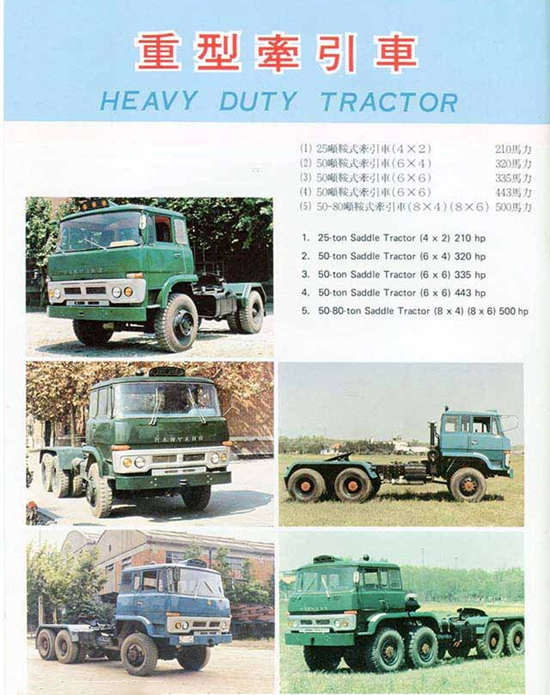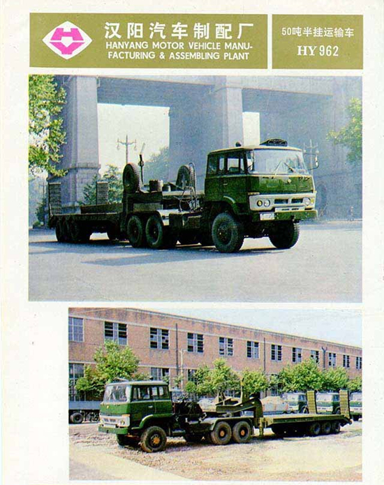 漢陽特種汽車制造廠生產(chǎn)軍用車的歷史可以追溯至上世紀(jì)60年代。當(dāng)時(shí)該廠完成了魚雷運(yùn)輸車的試制任務(wù),從而步入軍工生產(chǎn)的行列,隨后漢陽又開發(fā)了導(dǎo)彈運(yùn)輸車、舟橋車等軍用車。進(jìn)入到上世紀(jì)70年代,隨著我國汽車工業(yè)缺重少輕的矛盾日漸突出,漢陽在1972年研制成功了HY470型25噸4x2重型半掛牽引車,1979年,又成功開發(fā)出50噸的6x4牽引車。