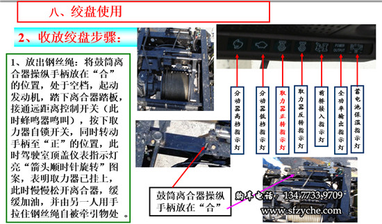 2、收鋼絲繩:拉上駐車(chē)制動(dòng)受控閥,并用木塊,石頭掩住車(chē)輪,將鼓筒離合器操縱機(jī)構(gòu)手柄放在“合”的位置,變速器處于空檔 ,起動(dòng)發(fā)動(dòng)機(jī),踏下離合器踏板,接通遠(yuǎn)距離控制開(kāi)關(guān)(此時(shí)蜂鳴器叫),按下取力器自鎖開(kāi)關(guān),同時(shí)轉(zhuǎn)動(dòng)手柄至“反”的位置,此時(shí)駕駛室頂蓋儀表指示燈亮“箭頭逆時(shí)針旋轉(zhuǎn)”圖案,表明取力器已掛上,此時(shí)慢慢松開(kāi)離合器,平穩(wěn)加油,即可收卷鋼絲繩,開(kāi)始牽引。牽引完后,踩下離合器踏板,按下取力器自鎖開(kāi)關(guān),同時(shí)轉(zhuǎn)動(dòng)手柄至“0”的位置,將鼓筒離合器操縱手柄放在“離”的位置,關(guān)閉遠(yuǎn)距離控制開(kāi)關(guān)。